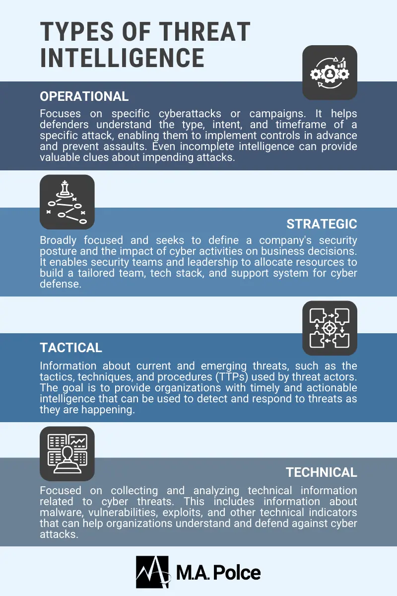 Tactical threat intelligence focuses on how threat actors carry out attacks, as well as the tools IT teams use to defend against them. It also helps a business evaluate the likelihood of becoming a target for different attacks. Tactical threat intelligence enables better decision-making for security controls and defense strategies. Examples include information about common attack infrastructures, and the tools threat actors use, as well as the types of organizations they target.